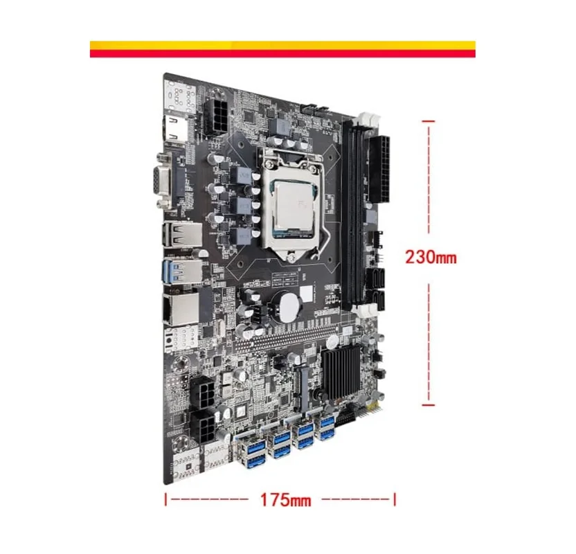 مادربورد مخصوص ماینینگ - قابلیت اتصال 8 کارت گرافیک بصورت USB - دارای خروجی تصویر HDMI - دارای دکمه خاموش و روشن بر روی مادربورد - همراه با یک عدد CPU به صورت باندل